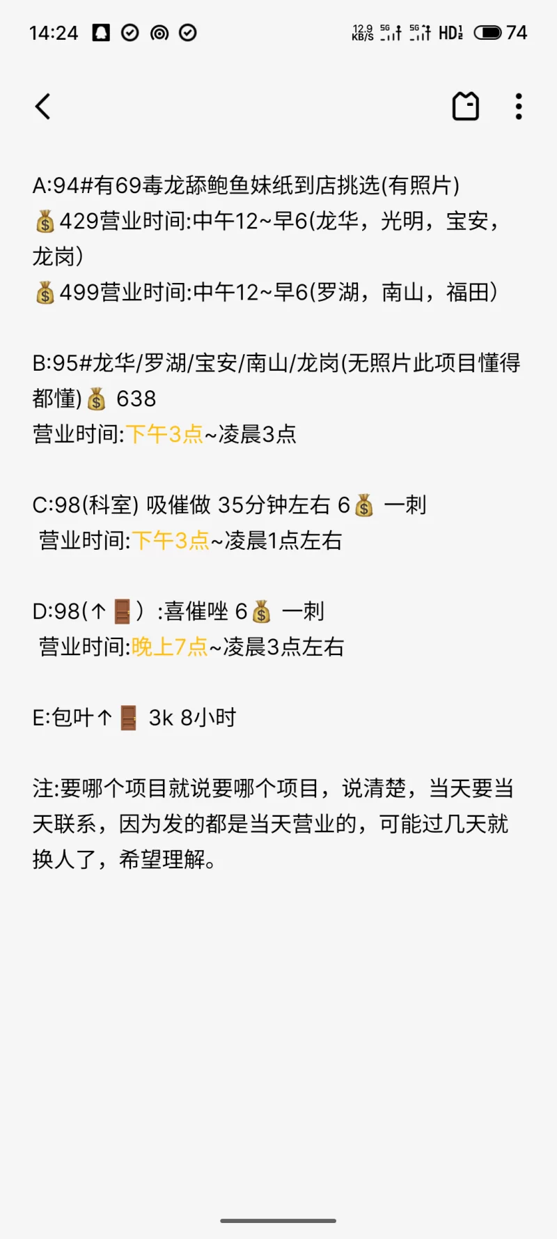价格: A:94有69毒龙舔鲍鱼妹纸到店挑选(有照片) 💰429营业时间:中午12~早6(龙华,光明,宝安,龙岗) 💰499营业时间:中午12~早6(罗湖,南山,福田) B:95#龙华/罗湖/宝安/南山/龙岗(无照片此项目懂得都懂)💰 638 营业时间:下午3点~凌晨3点 C:98(科室) 吸催做 35分钟左右 6💰 一刺 营业时间:下午3点~凌晨1点左右 D:98(↑🚪):喜催唑 6💰 一刺 营业时间:晚上7点~凌晨3点左右 E:包叶↑🚪 3k 8小时