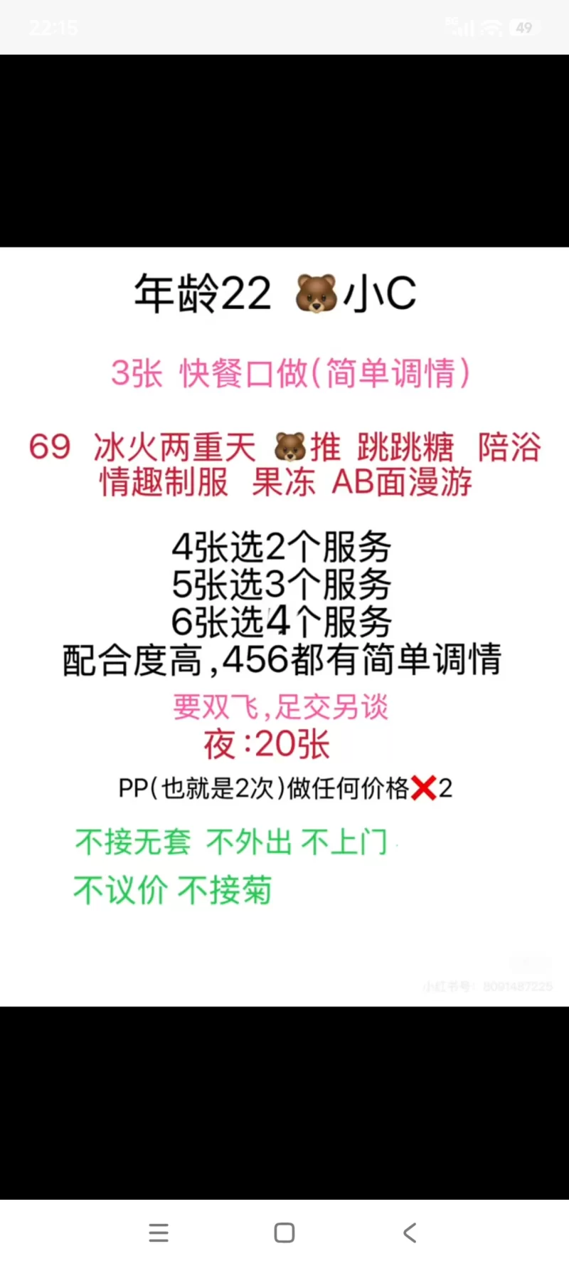 服务项目: 口,做,简单调情,69 冰火,跳跳糖,陪浴 情趣制服,果冻,AB面漫游